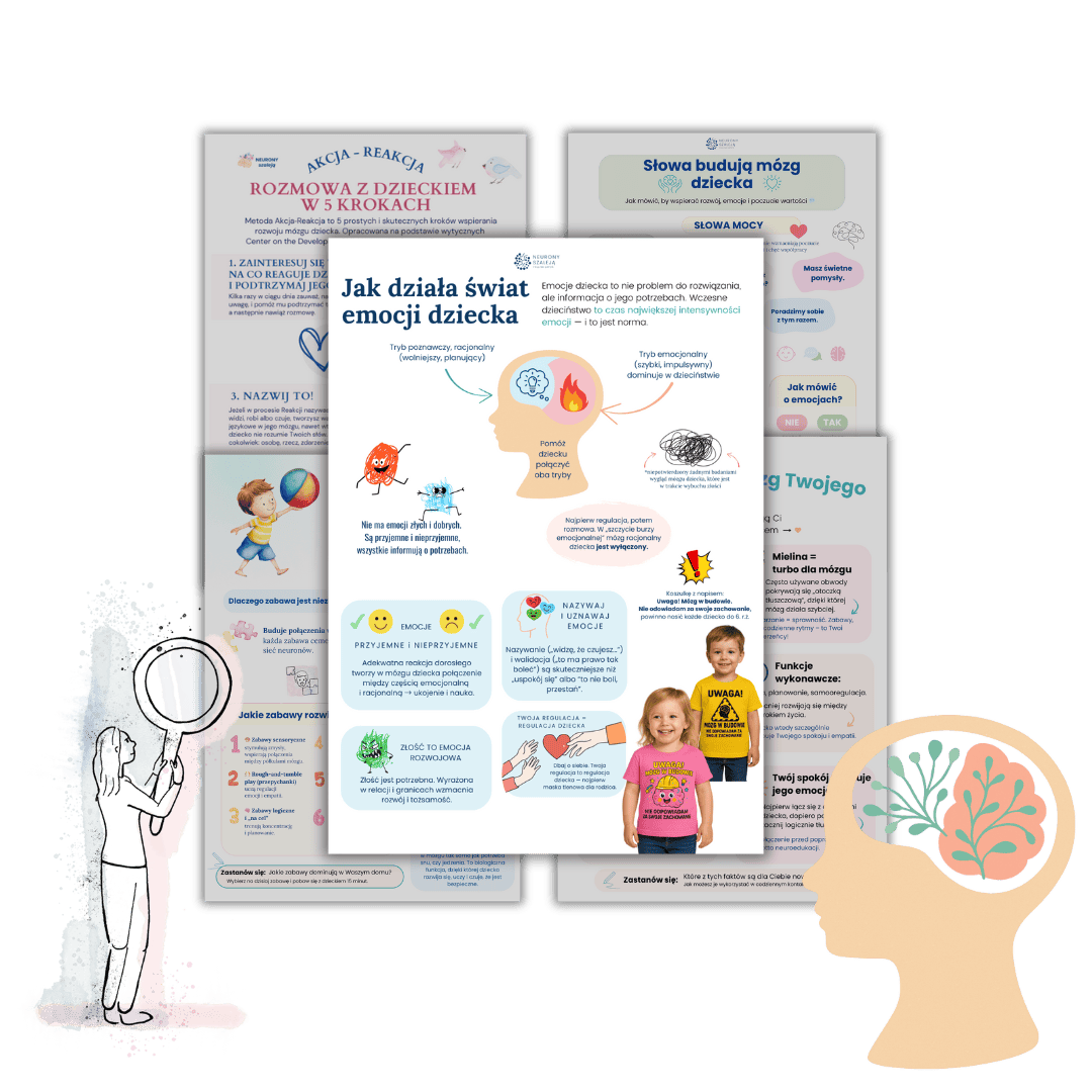 Pięknie zaprojektowane grafiki podsumowujące najważniejsze mechanizmy mózgu, m.in. metodę Akcja–Reakcja, regulację emocji, podstawy rozwoju.